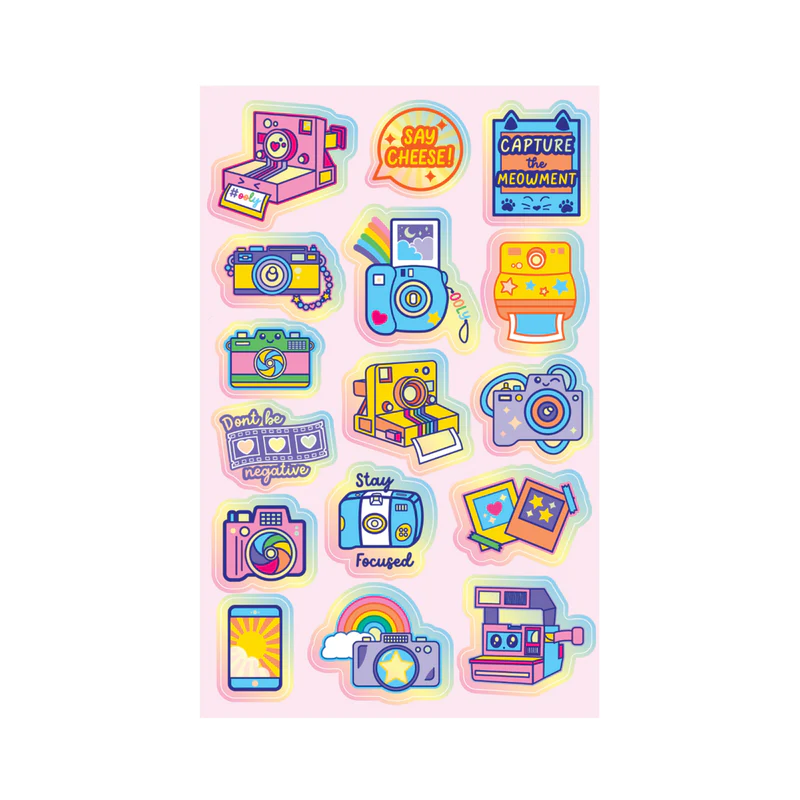 Există Polaroid, camera digitală, ceva film și, bineînțeles, smartphone-ul. Și mai bine, fiecare autocolant are un efect de folie metalic elegant, astfel încât veți vedea un curcubeu de culori atrăgător pe măsură ce lumina care lovește autocolantele se schimbă. Acestea sunt perfecte pentru a vă prezenta la rechizite școlare, cum ar fi caiete, cutii de prânz, case de creioane și multe altele! O foaie de folie metalică