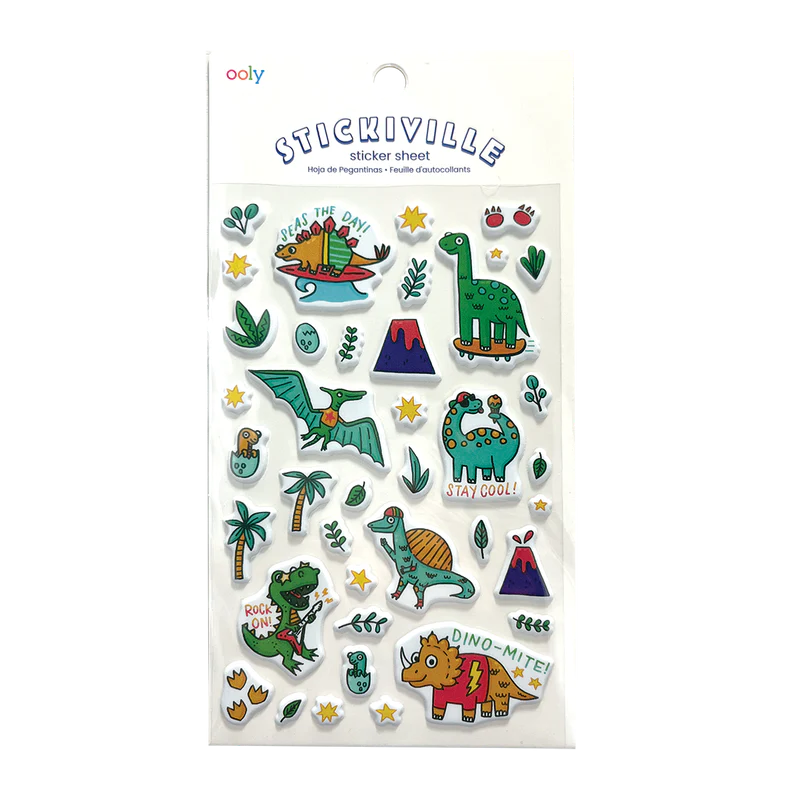 Kidozaurii de pretutindeni vor adora această foaie de autocolante dino-acarieni din colecția Stickiville. Aceste autocolante umflate capricioase prezintă o varietate de personaje drăguțe de dinozauri.
