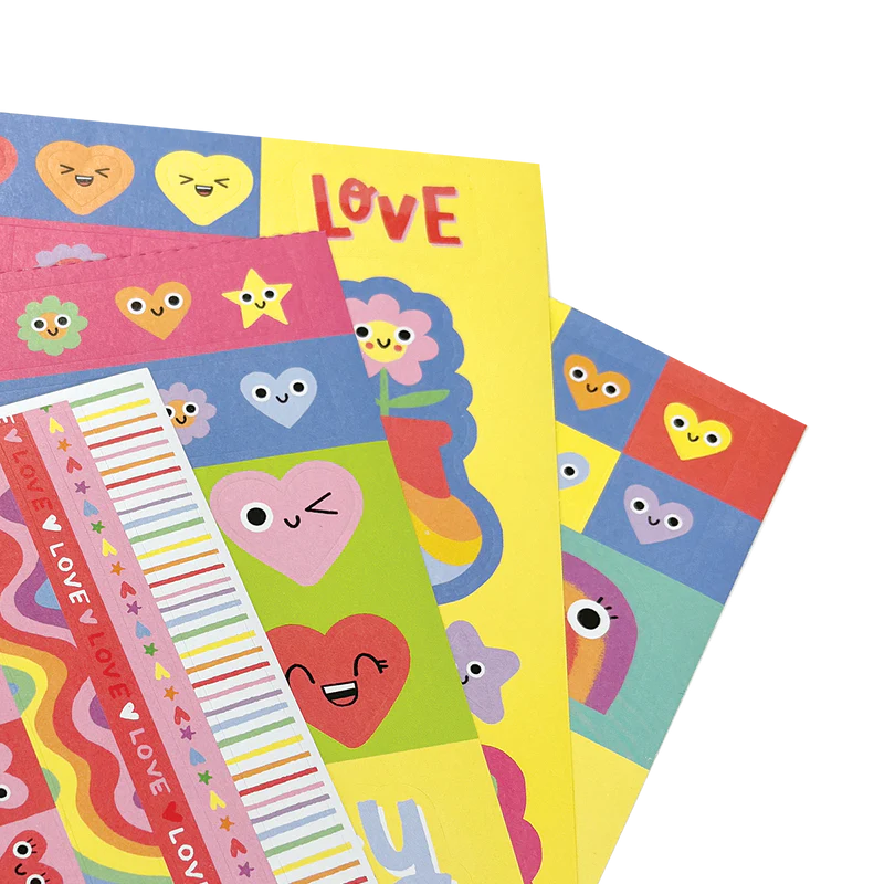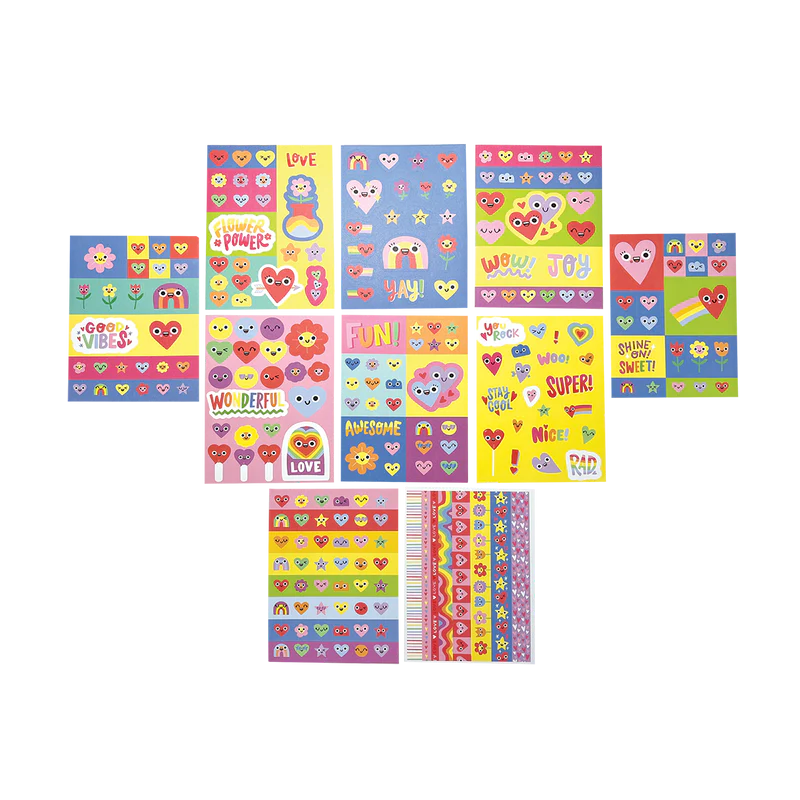 Design-urile prezintă o varietate de inimi, flori și curcubee, toate cu fețe vesele și zâmbitoare Include o carte de autocolante cu zece foi de autocolante Autocolante pe hârtie