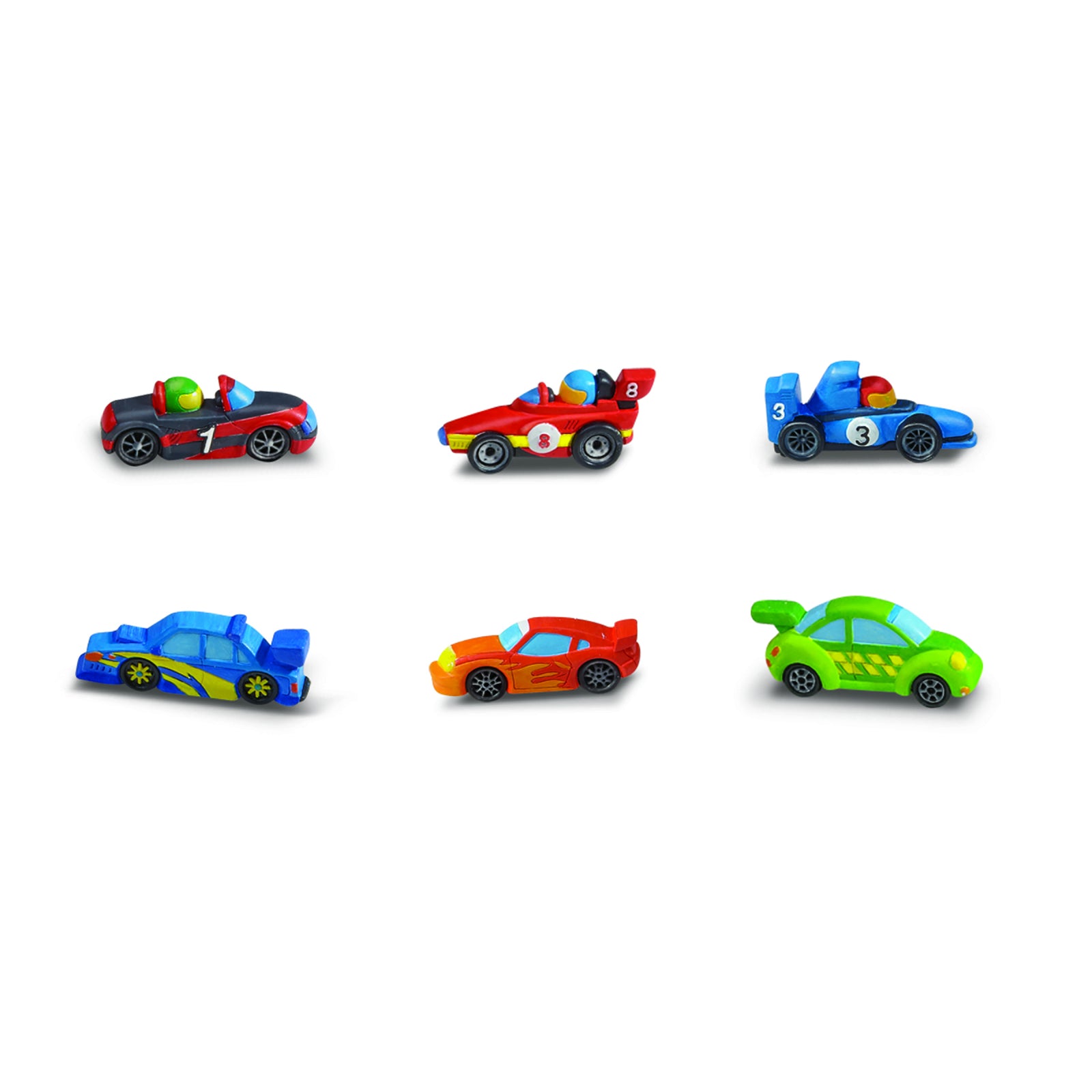 Matriță cu 6 modele, pudră de ipsos, magnet, știfturi, bandă de vopsea în 6 culori, pensulă și instrucțiuni detaliate. Conținutul este suficient pentru a face 6 Racers.