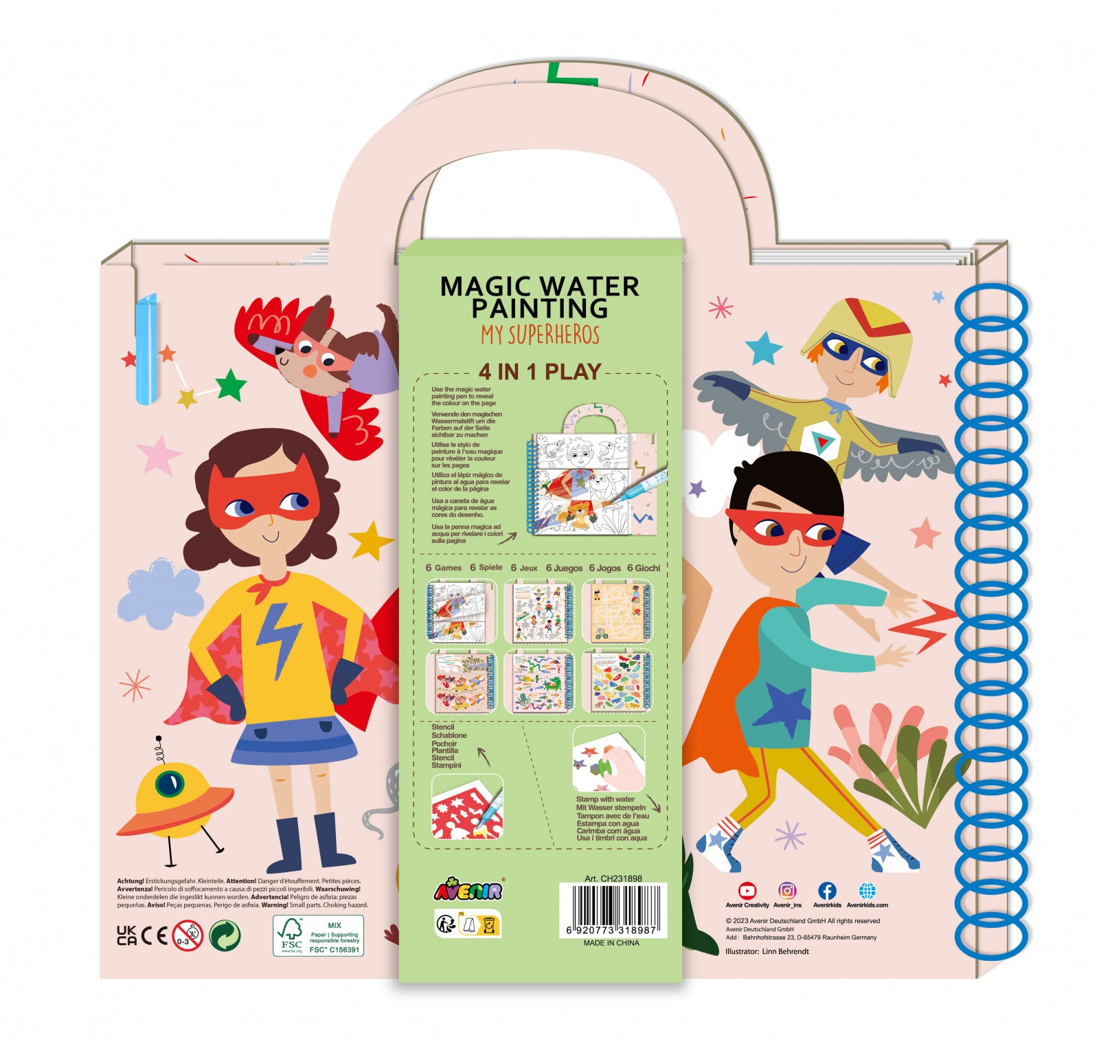 Fiecare carte include suprafețe de colorat reutilizabile, multiple activități distractive și un stilou cu apă reincarcabil. Umple stiloul cu apă de la robinet, apoi desenează pentru a dezvălui culorile pe pagini - acestea vor dispărea când apa se usucă, apoi poți începe din nou, ca prin farmec!