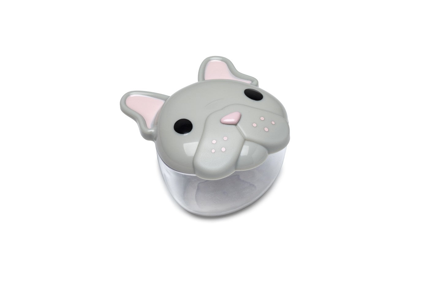 Recipientul de gustări Melii, Bulldog este alegerea perfectă pentru părinții care doresc un recipient sigur, ușor de folosit și adorabil pentru gustările copilului lor!