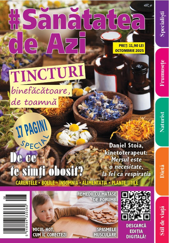 Toamna și-a intrat pe deplin în drepturi, iar mulți dintre noi resimțim deja efectele schimbării de sezon: energie mai puțină, astenie, întrebări legate de starea de sănătate. În ediția de octombrie a revistei Sănătatea de Azi, găsești răspunsuri clare și soluții naturale pentru a-ți menține echilibrul fizic și emoțional în această perioadă de tranziție.
