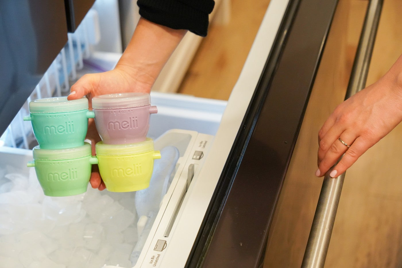 Configurație flexibilă: Recipientele se pot atașa orizontal sau vertical, economisind spațiu în congelator.