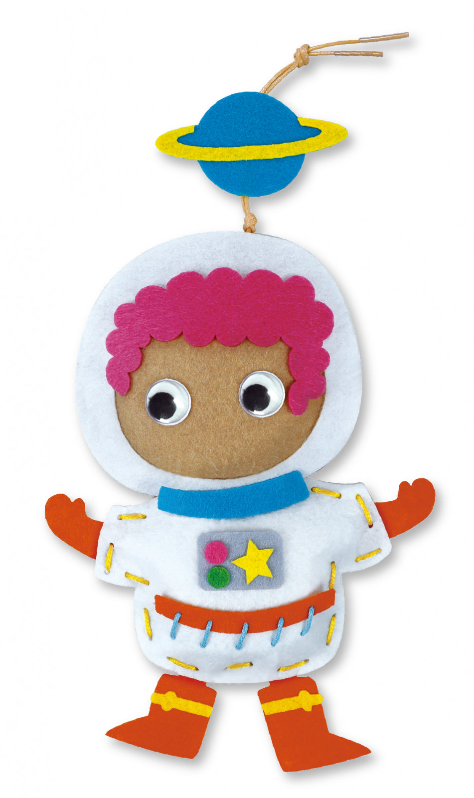 Acest kit conține 1 personaj adorabil cu tematică astronaut, împreună cu foi de pâslă pretăiate, autocolante decorative din pâslă, ochi de plastic, umplutură din bumbac și șireturi colorate.