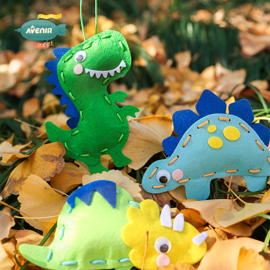 Acest kit conține 3 personaje adorabile cu tematică dinozauri, împreună cu foi de pâslă pretăiate, autocolante decorative din pâslă, ochi de plastic, umplutură din bumbac și șireturi colorate.