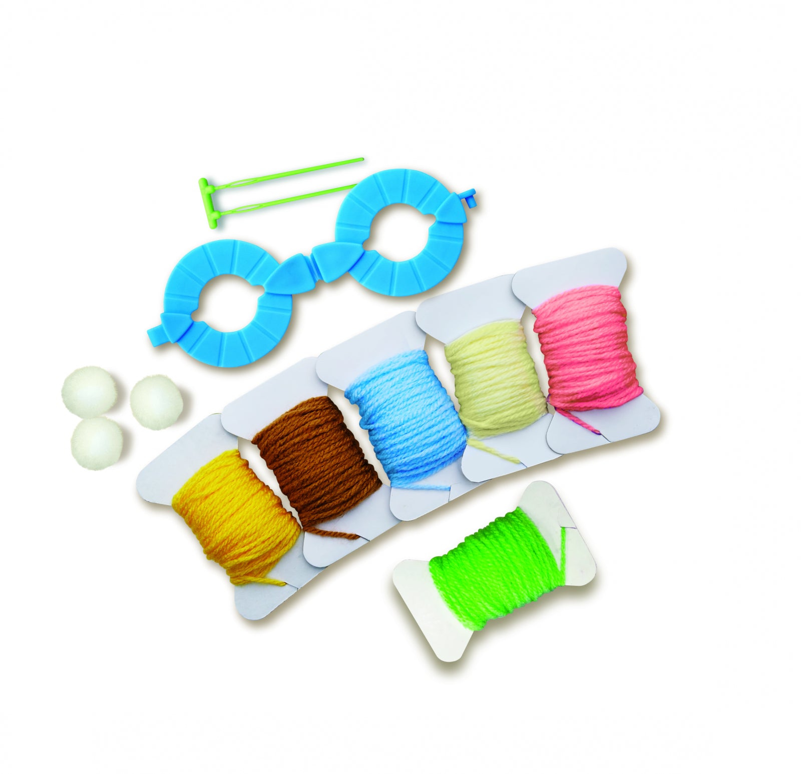 Conține 6 bobine de fire colorate, 1 instrument de țesut pompom, 6 perechi de ochi și nas, 1 set de forme de pâslă, 1 pachet de lipici și instrucțiuni detaliate.
