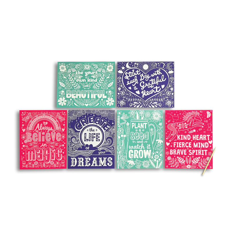Această trusă de artă de zgâriat nu este doar o activitate distractivă pentru o zi ploioasă, ci și o operă de artă care te face să te simți bine după ce o termini! Sunt incluse șase hârtii de răzuit din foiță aurie sau argintie, împreună cu un creion de răzuit. Fiecare hârtie prezintă un mesaj motivațional, astfel încât, odată zgâriată, rămâi cu ceva care chiar strălucește.