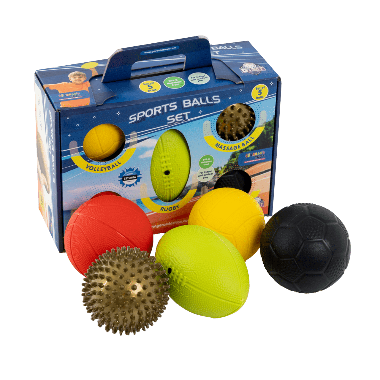 Setul conține 5 mingi de sport diferite: minge de masaj (dimensiune cca 10 cm), volei (dimensiune 9 cm), fotbal (dimensiune 10 cm), rugby (lungime 15 cm, lățime 10 cm) și baschet (dimensiune 11 cm).