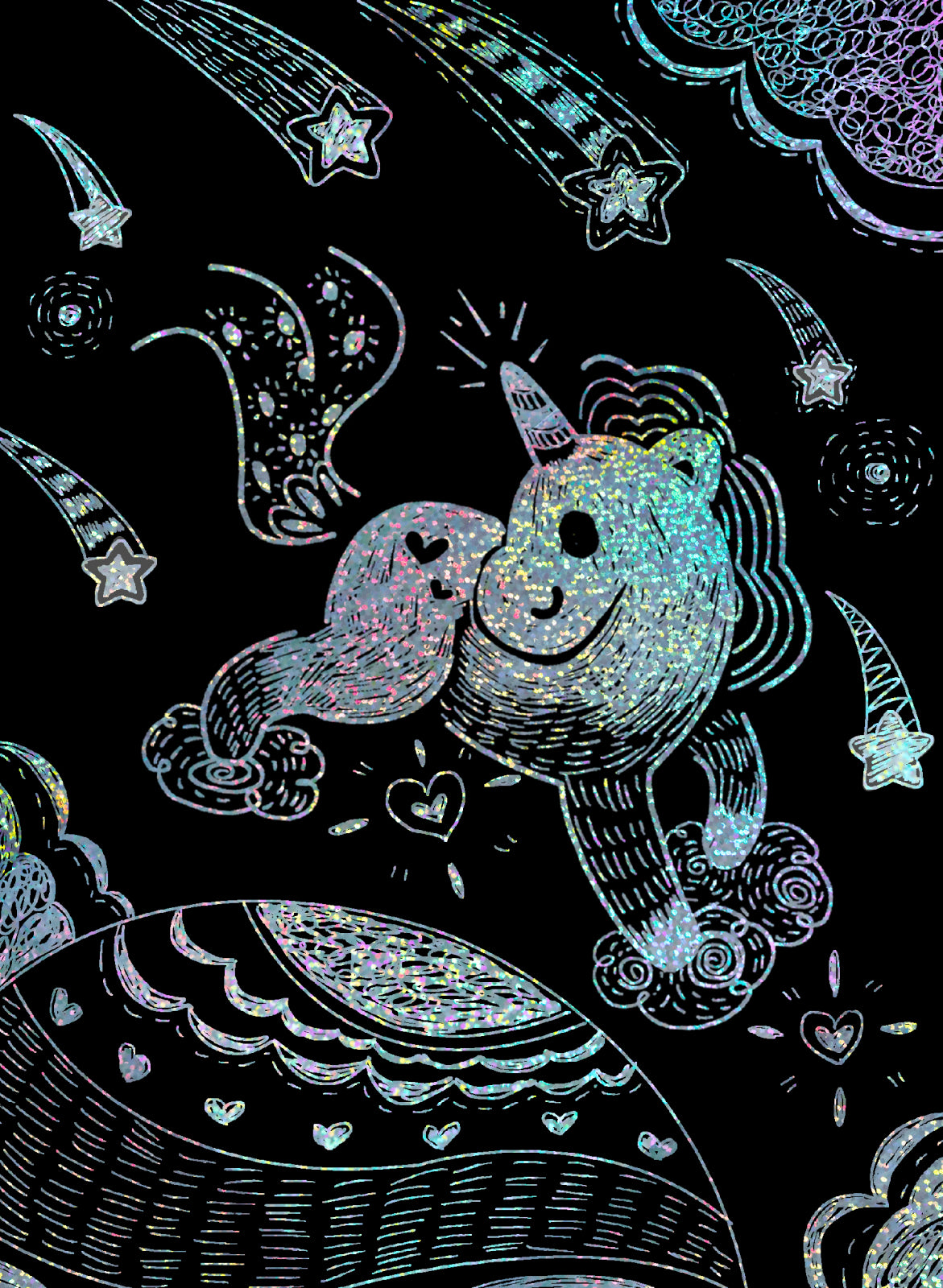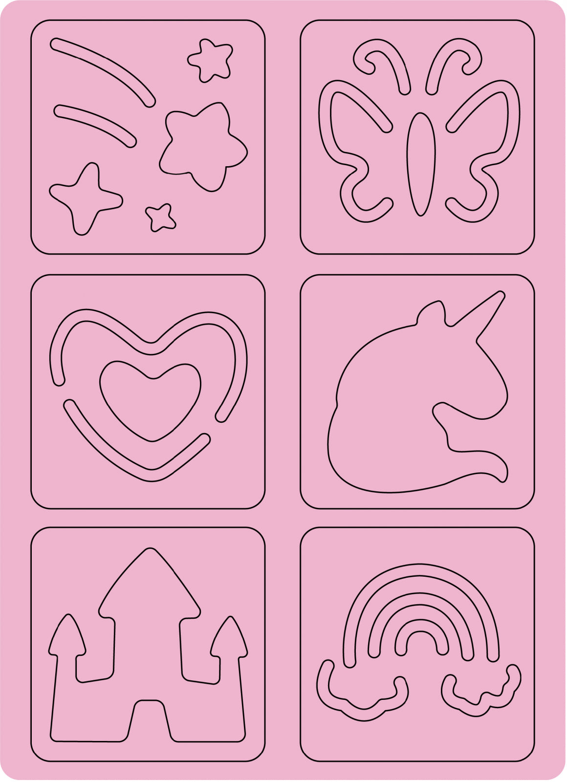 Cu "Scratch with Stencils", cei mici pot crea opere de artă uimitoare folosind șabloanele incluse și tehnica de scratch, descoperind bucuria și satisfacția în fiecare desen realizat.