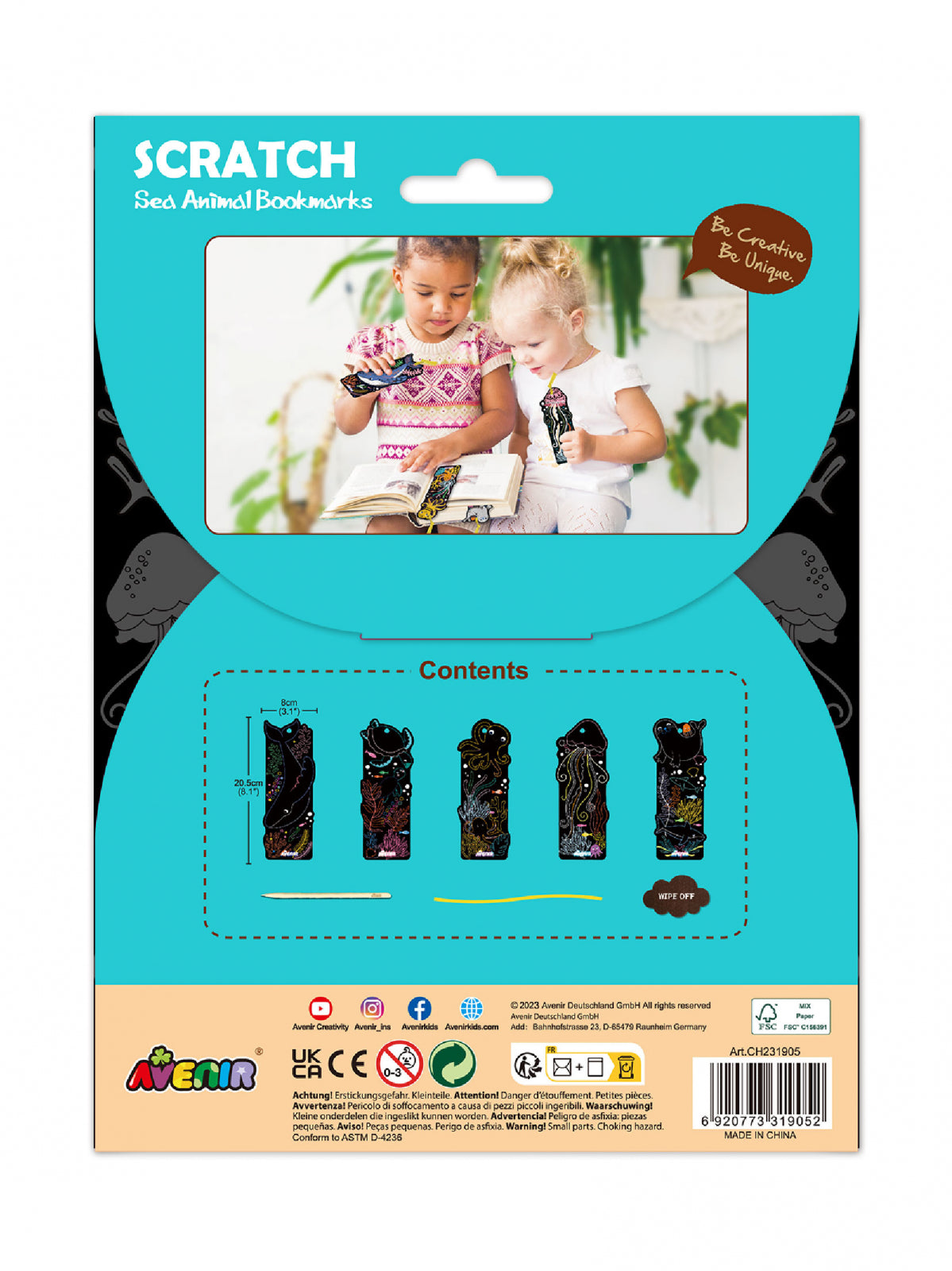 Setul include: 5 semne de carte pentru razuit, 1 stilou de răzuit, 1 bandă, și un șervețel de curățare în formă de nor.