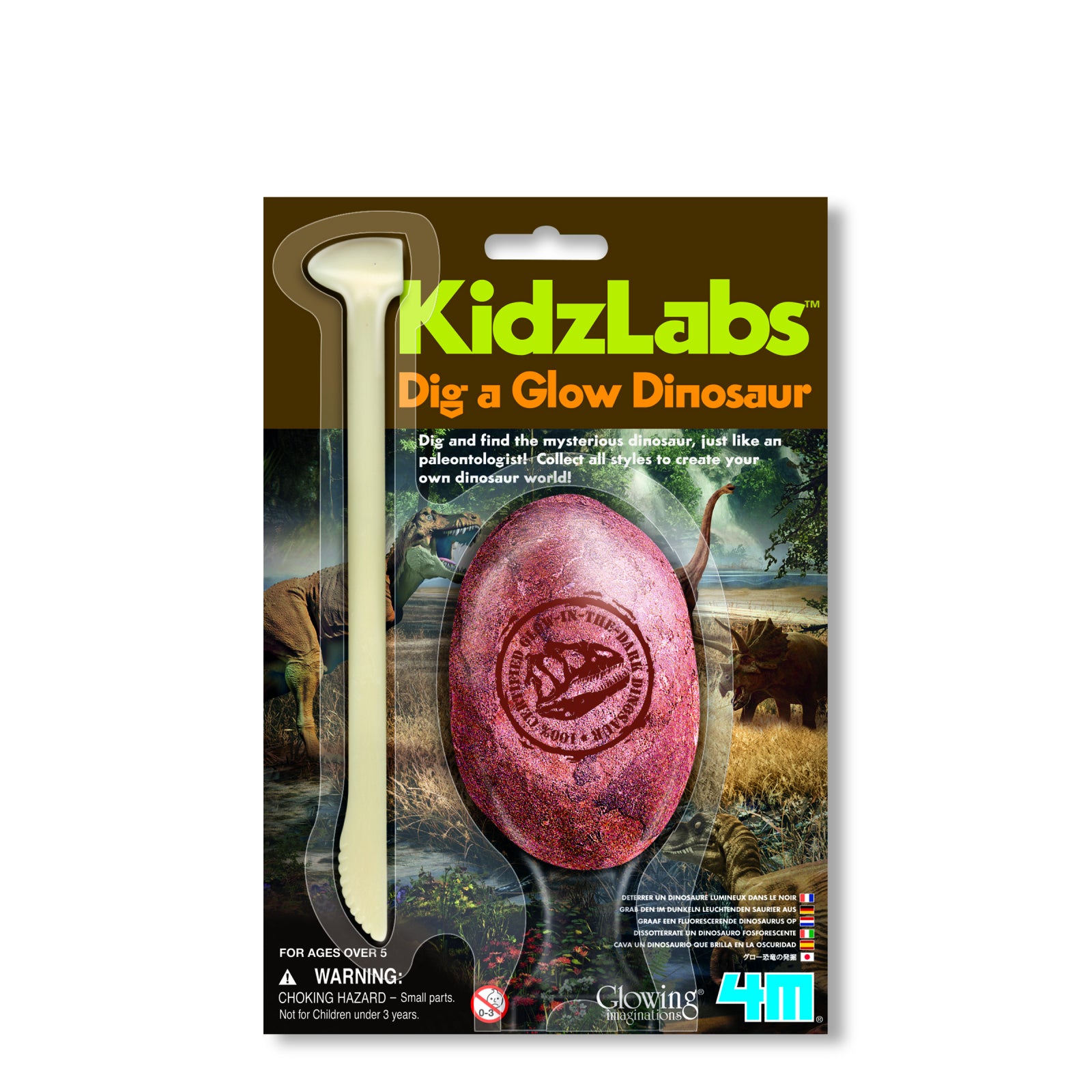 Conține un instrument special de săpat și un dinozaur care strălucește în întuneric înglobat în ipsos. 6 stiluri diferite de dinozaur disponibile.