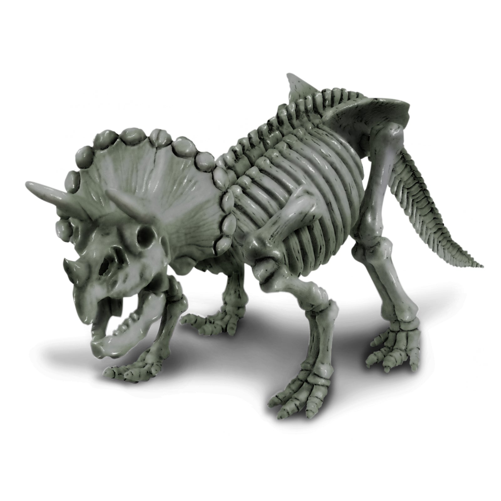 Include bloc de ipsos cu schelet Triceratops încorporat, unealtă de săpat, perie, ceară moale pentru poziționarea fosilei, afișaj din carton cu platforma și fapte amuzante. Instrucțiuni detaliate de asamblare și îngrijire incluse. Scheletul măsoară aproximativ 19 cm înălțime când este asamblat.