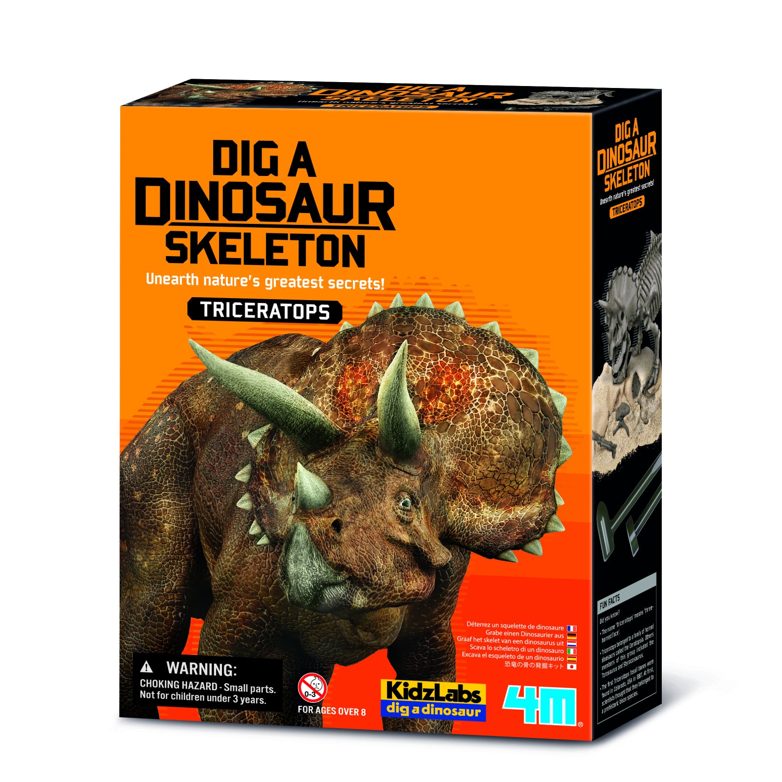 Sapă un dinozaur Triceratops: încorporat în acest bloc dur de ipsos este un schelet complet, realist al unui Triceratops – Și depinde de tine să-l scoți. Utilizați capătul plat al instrumentului de săpat pentru a răzui cu grijă bucăți de tencuială, puțin câte puțin. Odată ce ai lovit osul, treceți la perie pentru a o elibera ușor de praf. Toate oasele se conectează cu ușurință între ele și se țin puternic folosind ceara moale inclusă. Configurați afișajul uimitor, astfel încât toată lumea să vă poată verifica descoperirea fascinantă – Există chiar și lucruri amuzante despre Triceratops imprimate pe spate. Sapă, descoperă și inspiră-te cu setul 4M Dig A Dinosaur. Schelet afișabil de Triceratops încorporat în cărămidă de ipsos.