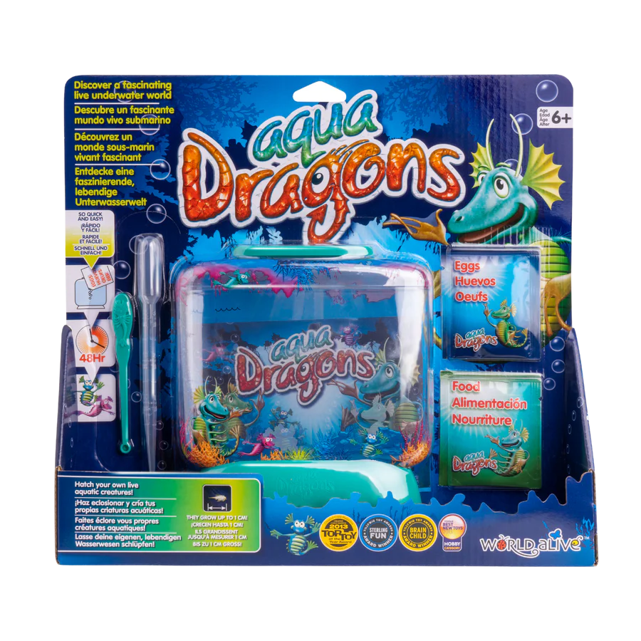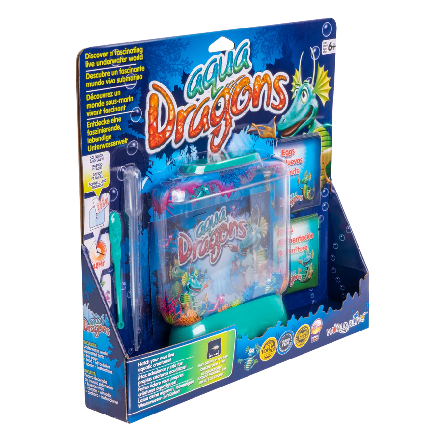 Aqua Dragons sunt creaturi acvatice pe care le vei putea aduce la viata eclozand din stadiul de ou, punandu-le in habitatul acvatic. Numele lor stiintific este Artemia Salinas si există încă din timpuri preistorice, ouăle lor conservate prin secetă aşteptând să intre în contact cu apa să eclozeze. Acest proces se numește diapoză. Aceste ființe mici pot crește până la 1 cm lungime și trăiesc până la 3-6 luni fiecare. Din familia crustaceelor, Aqua Dragons arata ca mici creaturi cu trei ochi, coada lunga si cap paros de dragon, care cresc pana la 1 cm lungime. Ei înoată și se joacă cu grație în fascinanta lor lume subacvatică. Aveți grijă de ei și veți vedea hranindu-se, cum cresc, înota, se joacă și chiar se reproduc.