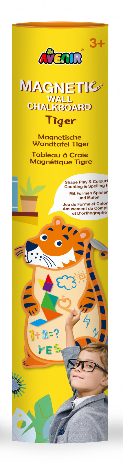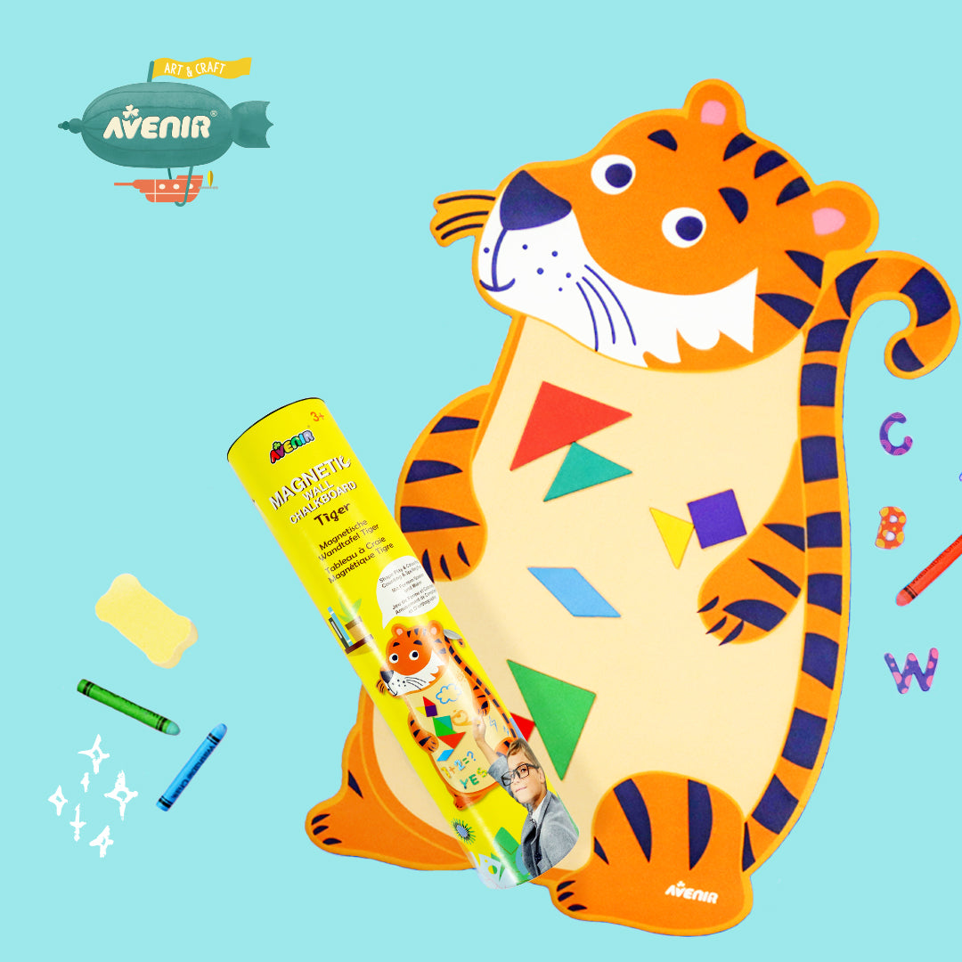 Acest set de perete conține o tablă magnetică de 58 cm x 36,5 cm în formă de tigru, 4 bețișoare de cretă lavabile, o gumă de șters, 43 de autocolante magnetice și 8 autocolante detașabile cu două fețe pentru a o atașa cu ușurință pe perete.