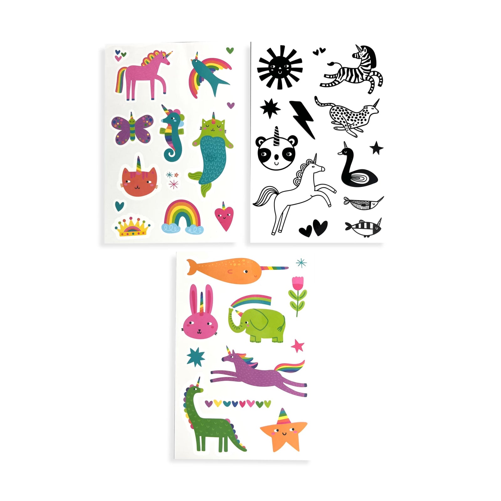 Happy tocmai a fost făcută purtabilă cu aceste foi de tatuaj pentru petrecerea de unicorn. Durabile și de lungă durată, aceste tatuaje temporare fermecătoare sunt perfecte pentru petreceri de aniversare, petreceri de somn sau orice adunare de copii creativi! Ce este nevoie pentru a organiza o petrecere cu unicorn? Pune-ți doar câteva dintre aceste tatuaje temporare, adu-ți imaginația și ai ceva magic uimitor! Acest mini pachet include trei foi de tatuaje cu tatuaje temporare care sunt construite pentru a fi durabile și de lungă durată. Două foi sunt colorate și una este alb-negru. Modelele includ unicorni, fluturi, inimi, curcubee și multe altele. Acestea sunt perfecte ca favoruri de petrecere, ca activitate de petrecere sau chiar ca un lucru distractiv de făcut într-o după-amiază relaxantă cu micuțul tău!